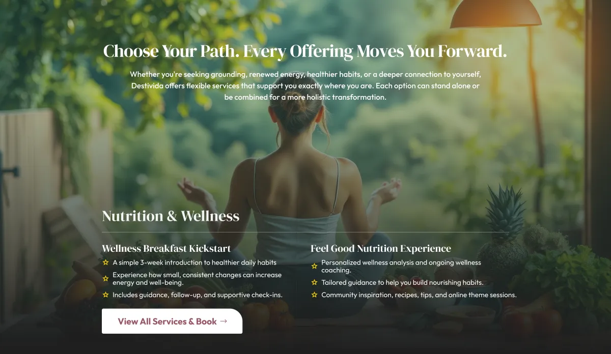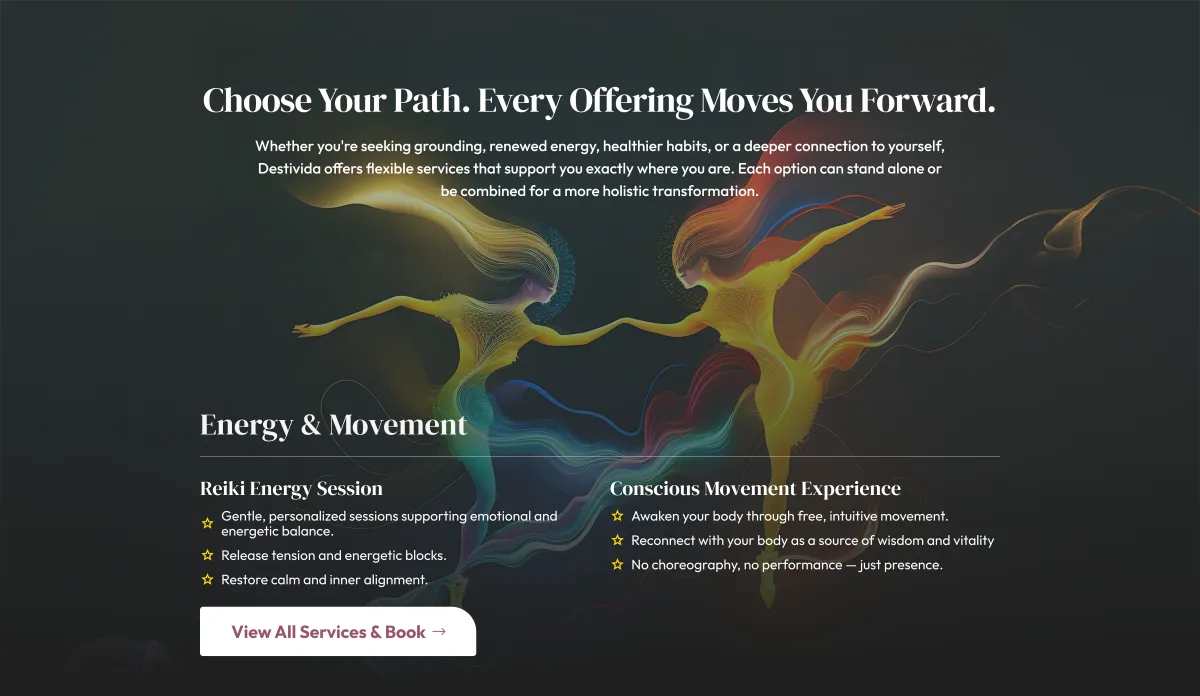 Over time, the elements of my journey — from conscious movement and dance to Reiki, holistic nutrition, and personal growth — naturally came together into a clear way of helping others. What began as my own healing became a simple and grounded framework for supporting people back to balance, energy, and inner alignment. In 2024, this evolved into Destivida: a lived methodology shaped by real experience and continuous growth.